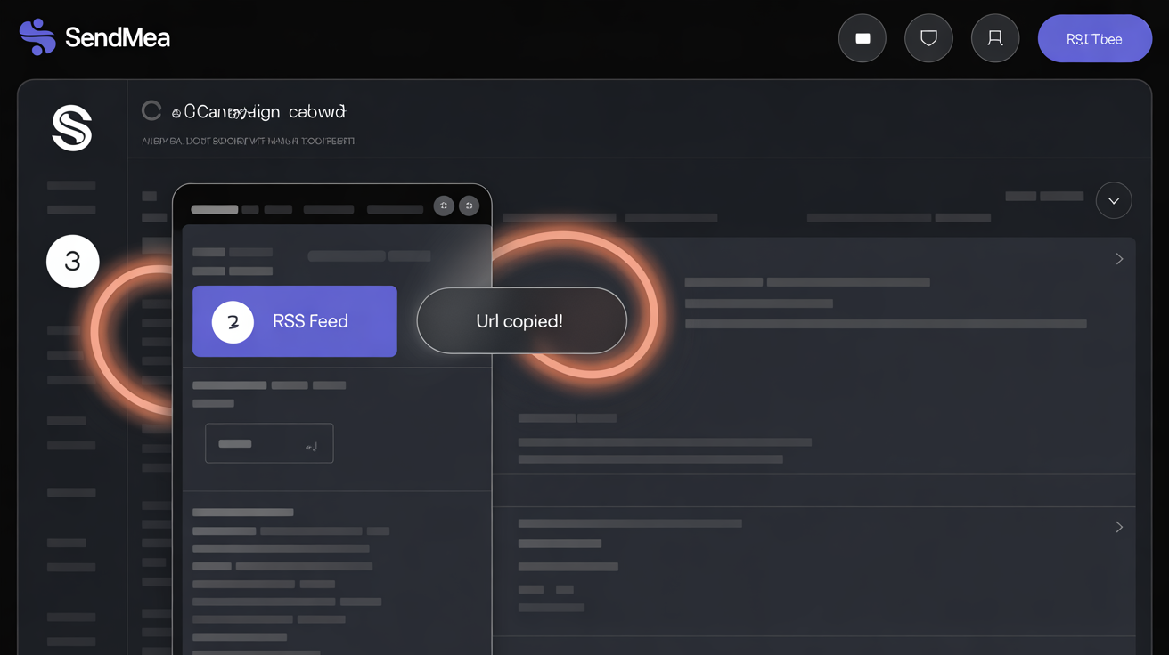 Navigate to your campaign in Sendmea, click the menu icon, and select "RSS Feed." The URL copies to your clipboard automatically.